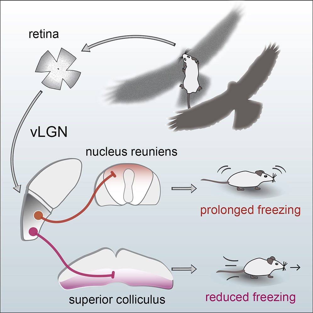 Let’s build some intuition about how cell types can specify an innate behavior. Mice live in fear of hawks and owls. Having the right instincts when they encounter flying predators can mean the difference between life and death. In their retinas, mice have a very peculiar and rare type of retinal ganglion cell—OFF-transient alpha RGC (tOFFα)—that is selective for dark looming things in the upper half of the visual field (e.g. scary birds). These cells are causally implicated in a reflex: mice either freeze in a prolonged manner or escape when they see a dark looming stimulus overhead.