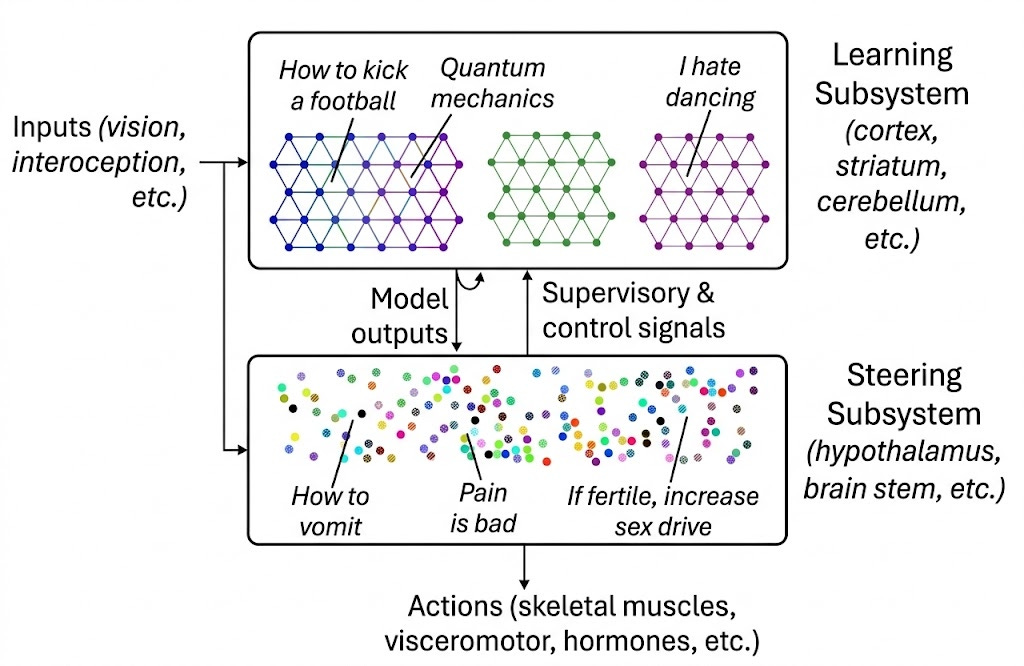 The Steering Subsystem—comprising the hypothalamus, brainstem, amygdala, and related structures—is entirely different. It implements bespoke, artisanal circuits: hand-crafted by evolution over millions of years, each one tuned to detect specific stimuli or generate specific behaviors. When you feel hungry, afraid, lonely, or curious, these signals originate in the Steering Subsystem. Each distinct motivation—salt appetite, fear of heights, sexual attraction, maternal care—requires dedicated circuitry that cannot be learned from scratch.
