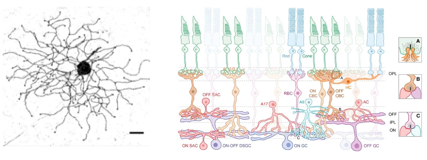 The retinal ganglion cell’s role is determined both by morphology (shape) and connectivity. This cell has a large dendritic arbor that stratifies in the right layer of the retina to receive input from specific amacrine cell types. It’s connected downstream to the right defensive behavior circuits— among others, the superior colliculus. Hence, both morphology and connectivity relate to its functional role.