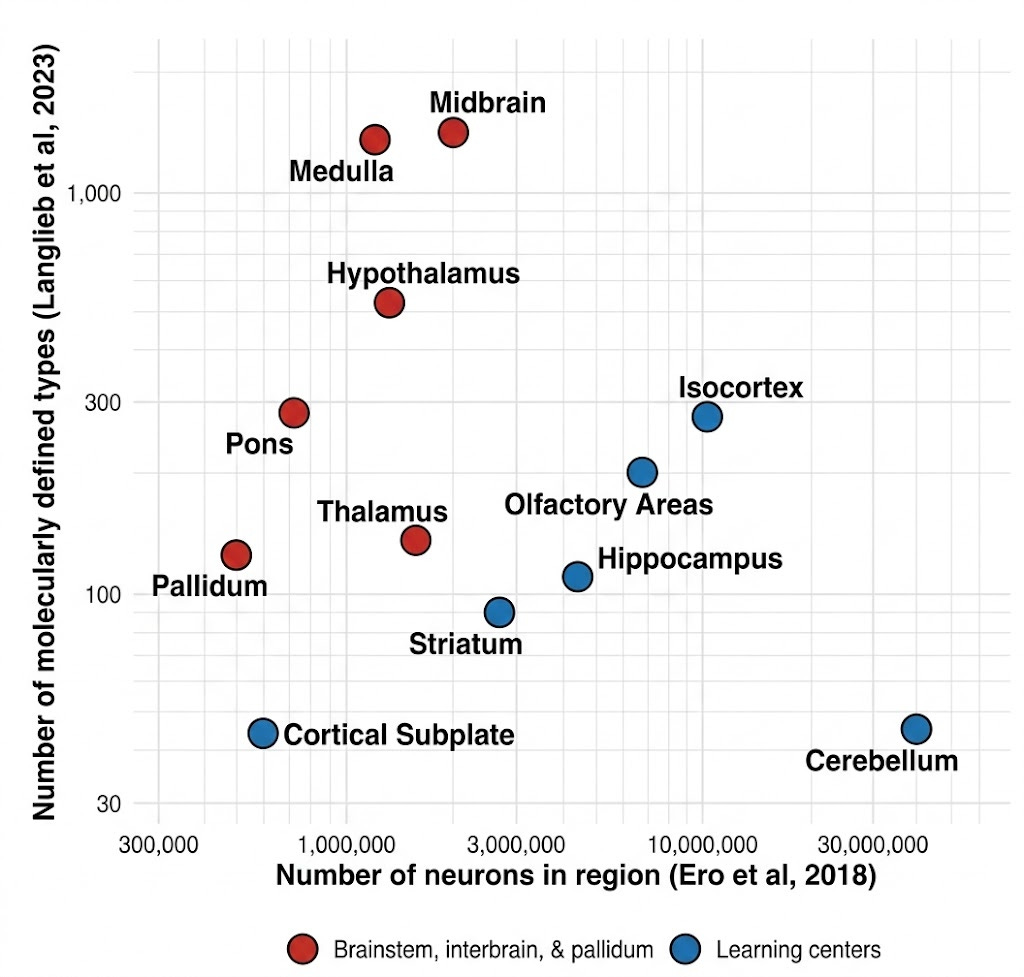 In an interview late last year on the Dwarkesh Podcast, Adam Marblestone—CEO of Convergent Research, former research scientist at Deepmind, and a true polymath in connecting neuroscience and AI—discussed what insights we might extract from complete brain wiring diagrams. His central claim is that the most valuable information in a connectome concerns innate reward functions and motivational systems: the circuits that tell learning systems what to learn. Adam mentioned that one way we would know that an area of the brain specifies reward information is that it contains many different cell types.