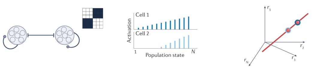 A deeper principle underlies the cell-type framework: connection topology determines computational function. By wiring up neurons in just the right way, we can create integrator, differentiators, and all sorts of bespoke circuits. A review by Khona and Fiete catalogs how different connectivity motifs produce different attractor dynamics (Khona & Fiete, 2022):