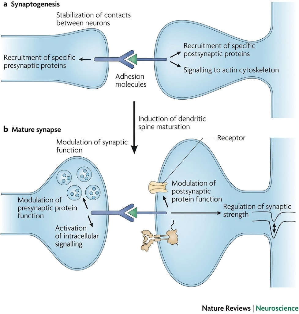 The concrete mechanism for biclique matching is not resolved in this computational paper. However, the discussion hints that it could involve cell adhesion molecules (CAMs) and receptors. When neurons of different types come into contact during development, surface proteins recognize each other through receptor-ligand interactions. If neurons of type A express receptor X and neurons of type B express ligand Y, and the X-Y combination triggers synapse formation, then all A will end up connecting with B (provided they’re within range).